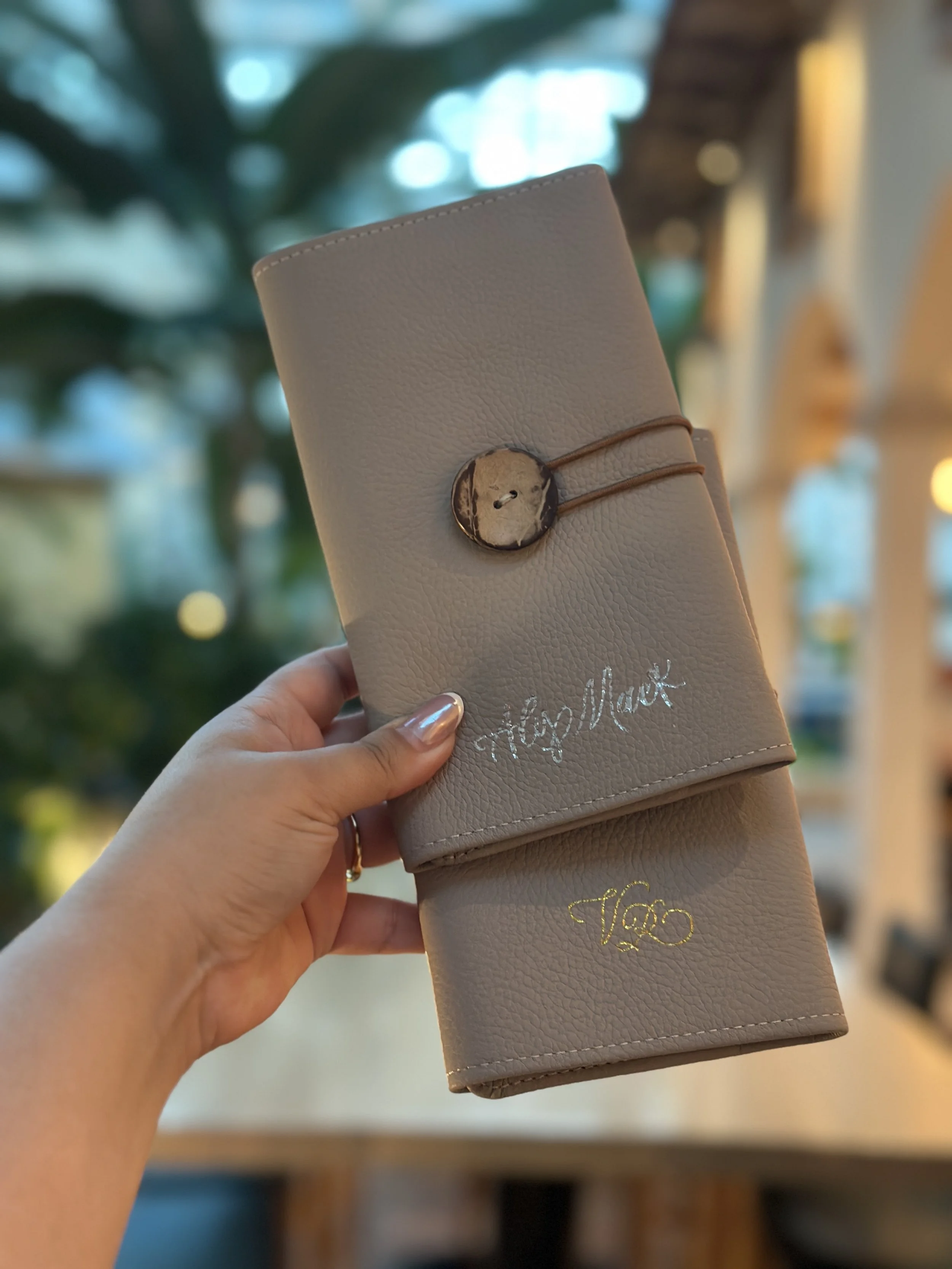 Corpay understood this well. Their guests were invited to choose from two types of refined leather organizers, both practical and stylish. Then, right in front of them, each piece was foil embossed live in either gold or silver, with the guest’s name or initials. They could even select the font style — classic block or calligraphy-inspired script — adding yet another layer of customization.